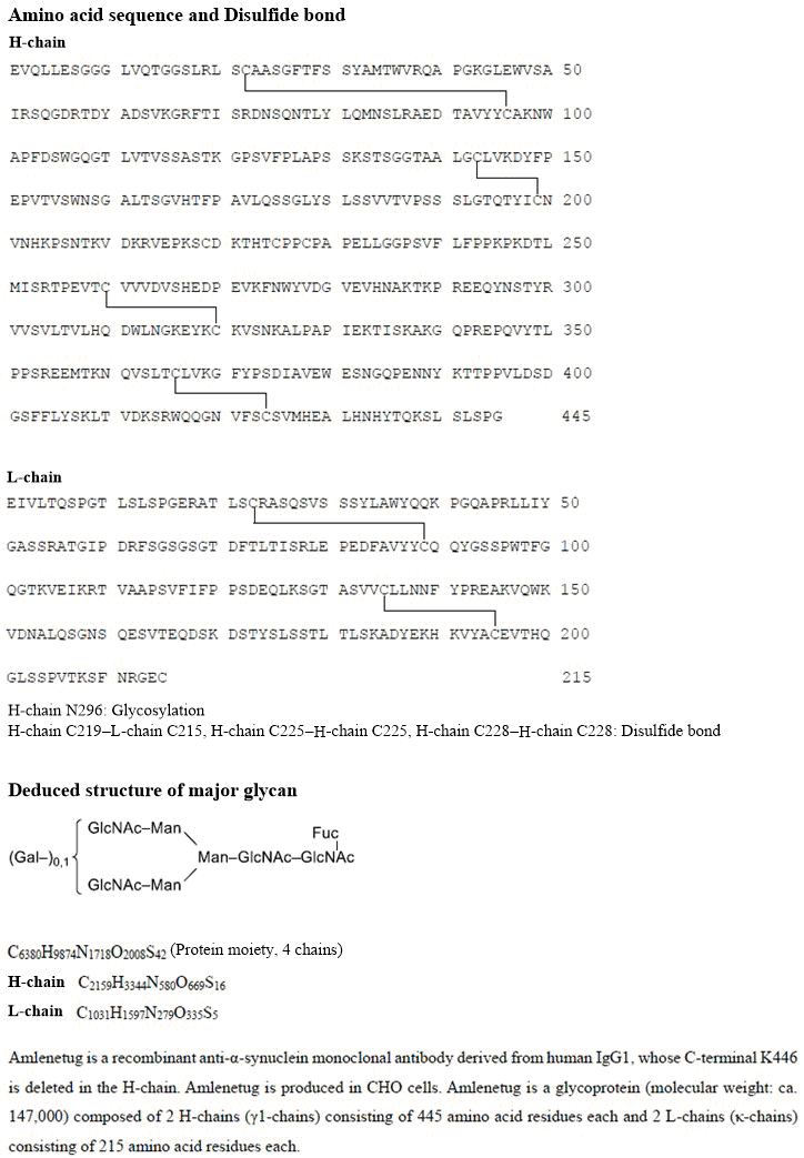Amlenetug is a recombinant anti-α-synuclein monoclonal antibody derived from human IgG1, whose C-terminal K446 is deleted in the H-chain. Amlenetug is produced in CHO cells. Amlenetug is a glycoprotein (molecular weight: ca. 147,000) composed of 2 H-chains (γ1-chains) consisting of 445 amino acid residues each and 2 L-chains (κ-chains) consisting of 215 amino acid residues each.
