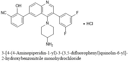 Paltusotine Hydrochloride 3-[4-(4-Aminopiperidin-1-yl)-3-(3,5-difluorophenyl)quinolin-6-yl]-2-hydroxybenzonitrile monohydrochloride C27H22F2N4O.HCl : 492.95 [2361216-83-1]