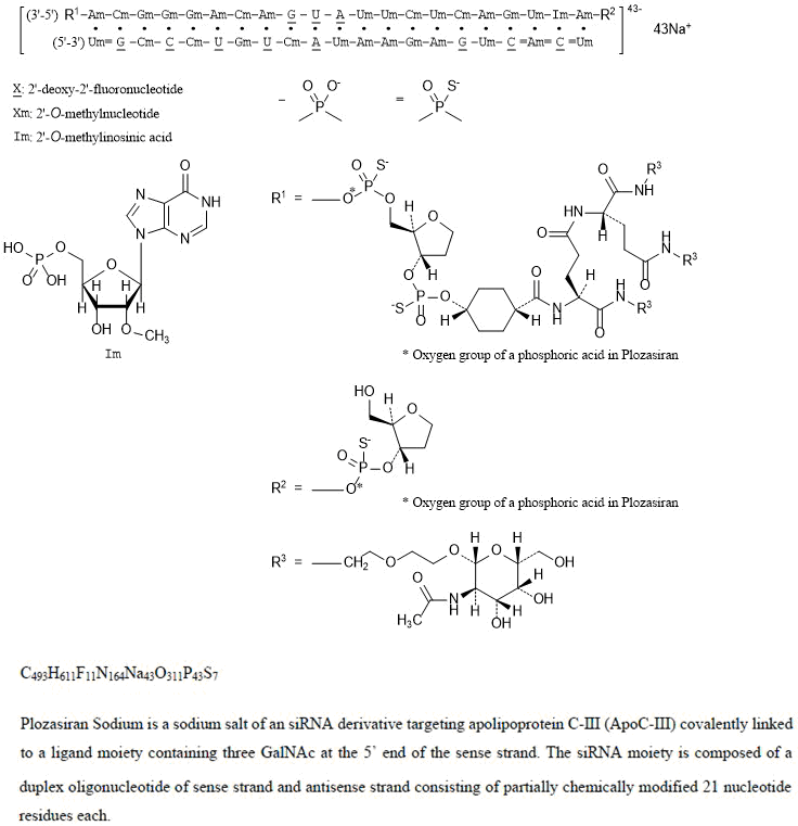Plozasiran Sodium is a sodium salt of an siRNA derivative targeting apolipoprotein C-III (ApoC-III) covalently linked to a ligand moiety containing three GalNAc at the 5’ end of the sense strand. The siRNA moiety is composed of a duplex oligonucleotide of sense strand and antisense strand consisting of partially chemically modified 21 nucleotide residues each.