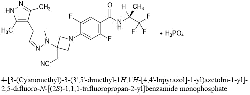 Povorcitinib Phosphate 4-[3-(Cyanomethyl)-3-(3',5'-dimethyl-1H,1'H-[4,4'-bipyrazol]-1-yl)azetidin-1-yl]-2,5-difluoro-N-[(2S)-1,1,1-trifluoropropan-2-yl]benzamide monophosphate C23H22F5N7O.H3PO4 : 605.45 [1637677-33-8]