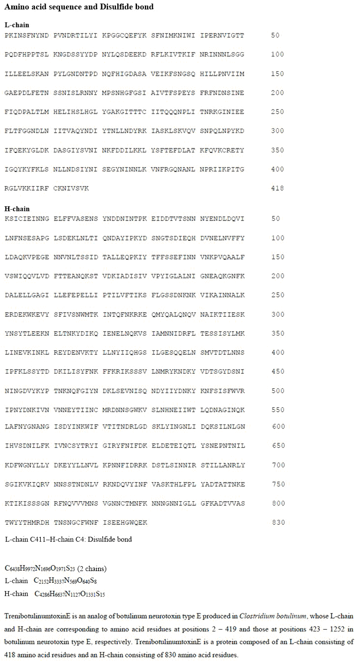 TrenibotulinumtoxinE is an analog of botulinum neurotoxin type E produced in Clostridium botulinum, whose L-chain and H-chain are corresponding to amino acid residues at positions 2 – 419 and those at positions 423 – 1252 in botulinum neurotoxin type E, respectively. TrenibotulinumtoxinE is a protein composed of an L-chain consisting of 418 amino acid residues and an H-chain consisting of 830 amino acid residues.
