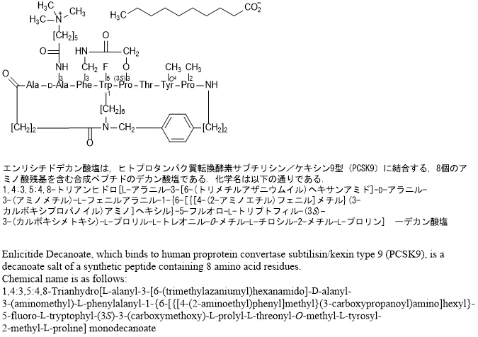 エンリシチドデカン酸塩は,ヒトプロタンパク質転換酵素サブチリシン/ケキシン9型(PCSK9)に結合する,8個のアミノ酸残基を含む合成ペプチドのデカン酸塩である.化学名は以下の通りである.