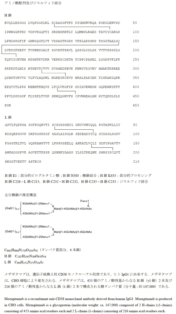 メザギタマブは,遺伝子組換え抗CD38モノクローナル抗体であり,ヒトIgG1に由来する.メザギタマブは,CHO細胞により産生される.メザギタマブは,453個のアミノ酸残基からなるH鎖(γ1鎖)2本及び216個のアミノ酸残基からなるL鎖(λ鎖)2本で構成される糖タンパク質(分子量:約147,000)である.